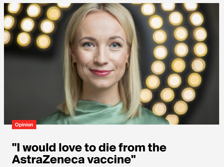 Jeg dør gjerne av AstraZeneca-vaksinen (English: I would love to die from the AstraZeneca vaccine)