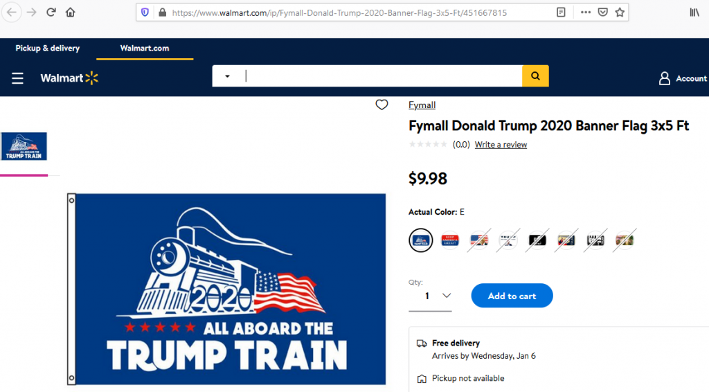 More details at: https://www.walmart.com/ip/Fymall-Donald-Trump-2020-Banner-Flag-3×5-Ft/451667815