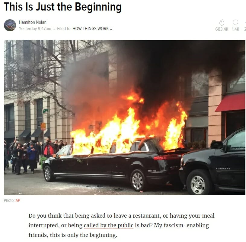 …Read a f*cking history book. Read a recent history book. The U.S. had thousands of domestic bombings per year in the early 1970s. This is what happens when citizens decide en masse that their political system is corrupt, racist, and unresponsive. The people out of power have only just begun to flex their dissatisfaction. The day will come, sooner that you all think, when Trump administration officials will look back fondly on the time when all they had to worry about was getting hollered at at a Mexican restaurant. When you aggressively f*ck with people’s lives, you should not be surprised when they decide to fuck with yours.