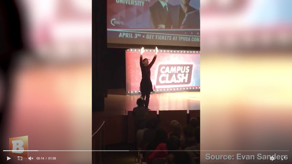 Turning Point USA’s Charlie Kirk and Candace Owens were speaking at a Louisiana State University event on Wednesday when a protester jumped on stage and proceeded to shout obscenities, while another protester in the audience shouted “death to white nationalism” at the two conservative pundits, one of whom is black.