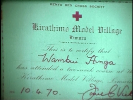 At approximately the 11:32 minute measure a Kenyan woman named Wambui Hinga is issued and presented with a certificate from the Kenya Red Cross Society. The certificate is dated 10.4.70 which could mean October 4, 1970 or April 10, 1970 depending on which date format was being used. Her name, Wambui Hinga, is written in cursive.