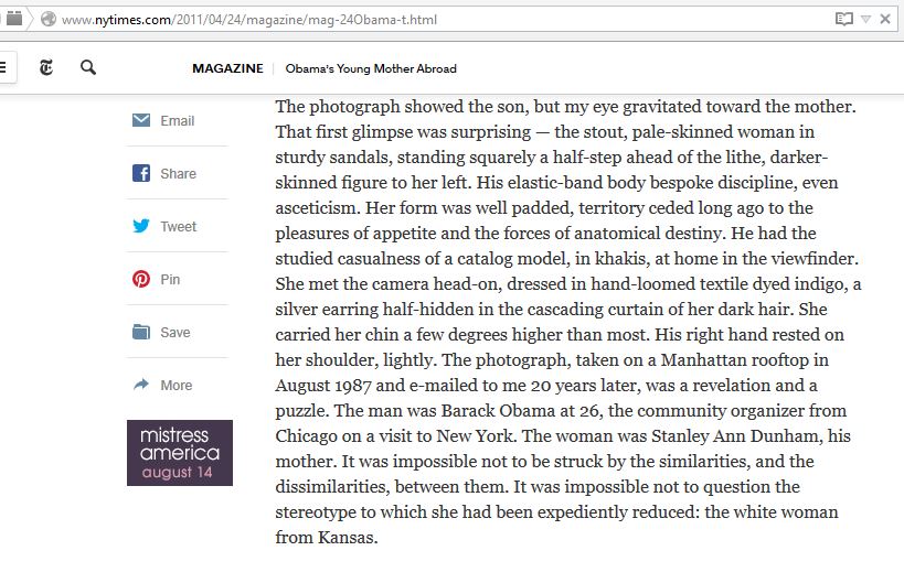 The photograph showed the son, but my eye gravitated toward the mother. That first glimpse was surprising — the stout, pale-skinned woman in sturdy sandals, standing squarely a half-step ahead of the lithe, darker-skinned figure to her left. His elastic-band body bespoke discipline, even asceticism. Her form was well padded, territory ceded long ago to the pleasures of appetite and the forces of anatomical destiny. He had the studied casualness of a catalog model, in khakis, at home in the viewfinder. She met the camera head-on, dressed in hand-loomed textile dyed indigo, a silver earring half-hidden in the cascading curtain of her dark hair. She carried her chin a few degrees higher than most. His right hand rested on her shoulder, lightly. The photograph, taken on a Manhattan rooftop in August 1987 and e-mailed to me 20 years later, was a revelation and a puzzle. The man was Barack Obama at 26, the community organizer from Chicago on a visit to New York. The woman was Stanley Ann Dunham, his mother. It was impossible not to be struck by the similarities, and the dissimilarities, between them. It was impossible not to question the stereotype to which she had been expediently reduced: the white woman from Kansas.