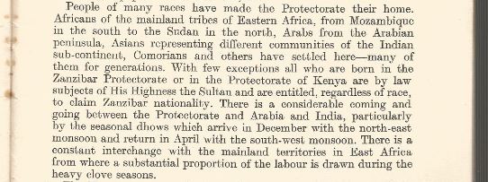 Page five (5), or page eleven (11) of the PDF, states that: With few exceptions all who are born in the Zanzibar Protectorate or in the Protectorate of Kenya are by law subjects of His Highness the Sultan and are entitled, regardless of race, to claim Zanzibar nationality.