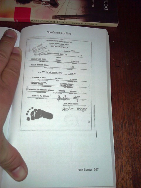 I want to affably and sincerely thank Ron Berger for including Barack Obama’s 1961 Coast Province General Hospital, Mombasa, British Protectorate of Kenya birth certificate, and my name, in his book.