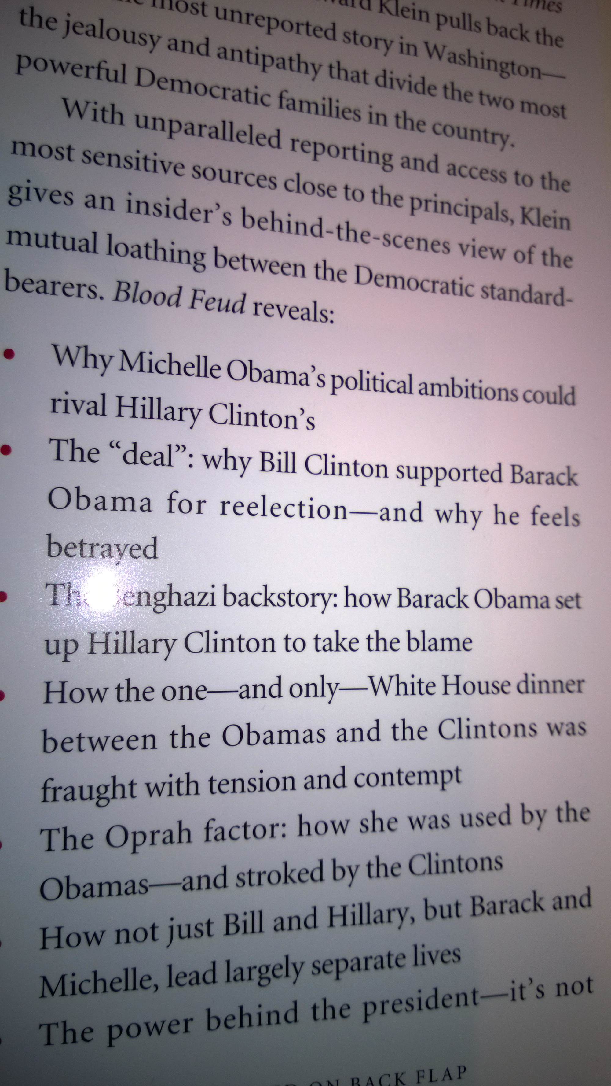 In any event, you may want to consider buying a copy of the book at the following link: Blood Feud: The Clintons vs. the Obamas