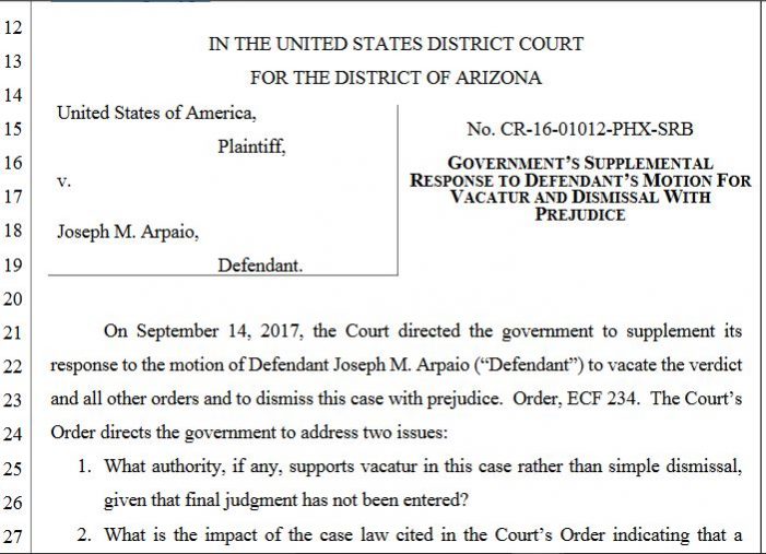 (Sep. 21, 2017) — Three attorneys and the acting chief of the U.S. Justice Department’s Public Integrity Section have filed a brief in response to a federal judge’s request prior to an October 4 hearing concerning the criminal conviction of former Maricopa County Sheriff Joseph M. Arpaio.