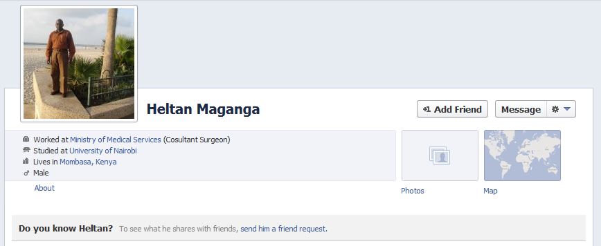 Using the same slew of incognito facebook accounts I have sent a number private messages to “Heltan Maganga”. He does sometimes reply, usually after a great deal of time has passed. For example, I once sent a very detailed and private message spelling out how I was doctor and how I was at one point in the Army and how I had previously worked in other countries within Africa and how and why I now wanted to volunteer my services at hospitals in Kenya.