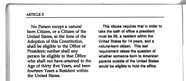 Should also be noted that Senate Publication 103-21, prepared with the assistance of Johnny H. Killian, states that the “natural-born citizen” clause of Article II, Section 2, Clause 5 of the US Constitution “raises the question of whether someone born to American parents outside of the United States would be eligible to hold the office”.