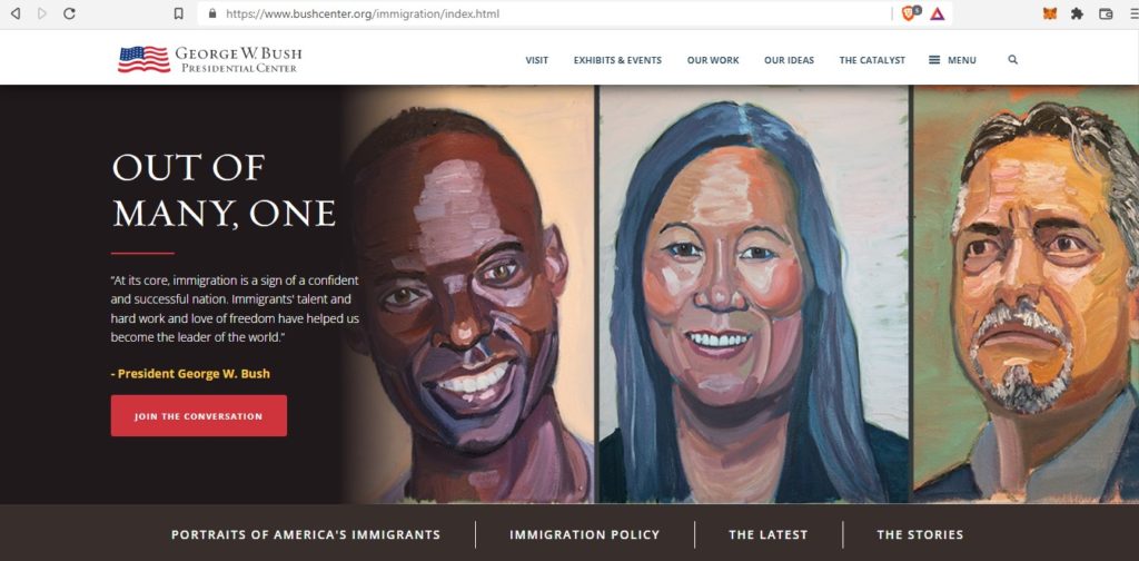 The images are from Bush’s book, Out of Many, One: Portraits of America’s Immigrants (published 2021) which is a collection of oil paintings which were all purportedly painted by Bush, himself. The book does contain portrait paintings of what appear to be White people but Bush’s website features only the non-Whites at the head of their immigration landing page.