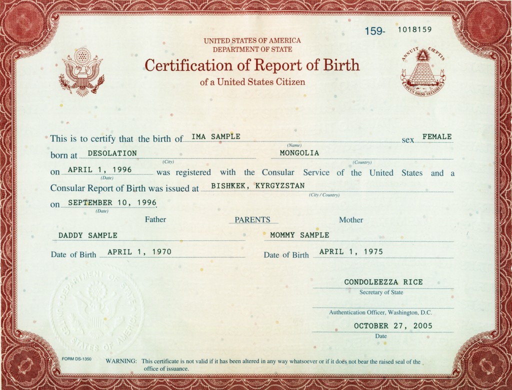 DS-1350 Certification of Report Birth issued by Department of State, United States: