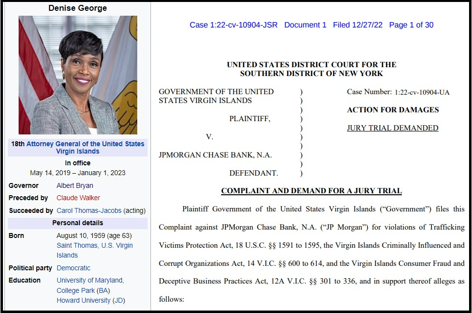 Case number 1:22-cv-10904-UA – Government of the US Virgin Islands vs JPMorgan Chase Bank. United States District Court for the Southern District of New York:
