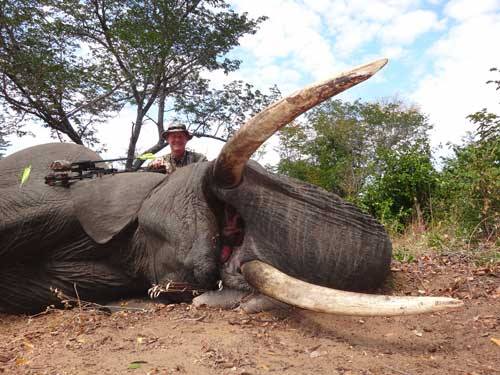 This Zimbabwe elephant is the sixth African elephant shot by Dr. Jan Seski. For this hunt Jan used our custom-built GrizzlyStick Momentum UFOC 175 arrows cut to 29 inches and fletched with 4-inch DuraVanes to accommodate his finger-shooting style.