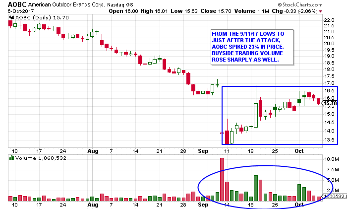 Something Changed in September Let’s now examine the trading patterns of AOBC and RGR in detail, just over two weeks “prior” to the attack. As you can see, AOBC bottomed on 9/11/17 at $13.30 before the spike higher began. From 9/11 to just after the attack, AOBC rose 23% in price. It did so on a noticeable increase in buy-side trading volumes.
