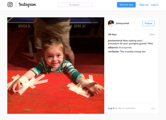Could a child really achieve the fancy tape job pictured on James Alefantis’ instagram, with his godchild taped to the table? In this video, one mother challenges her seven-year-old son and her four-year-old daughter to tape her hand to the table. Their results do not yield the same result displayed on Alefantis’ instagram.