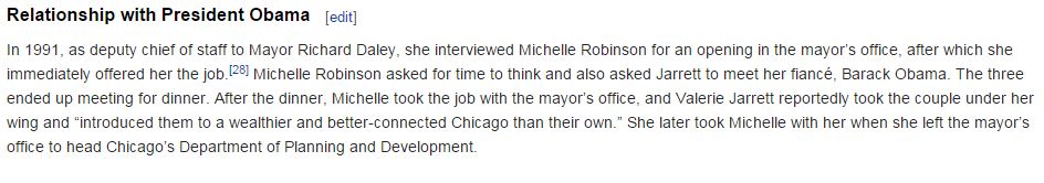 I don’t know whole lot about Valerie Jarrett but I did read the following (regarding her longtime relationship with the Obamas) at Wikipedia: