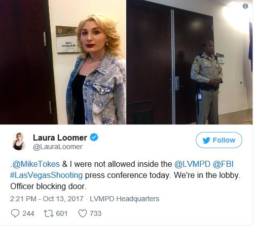 The Las Vegas police department blocked conservative reporters Laura Loomer and Mike Tokes from entering the presser.