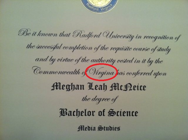 Meghan Leah McNeice graduated from Radford University this year (May, 2013) with a Bachelor of Science in Media Studies. Her diploma, pictured at the head of this report, spells the State of Virginia as Virgina.