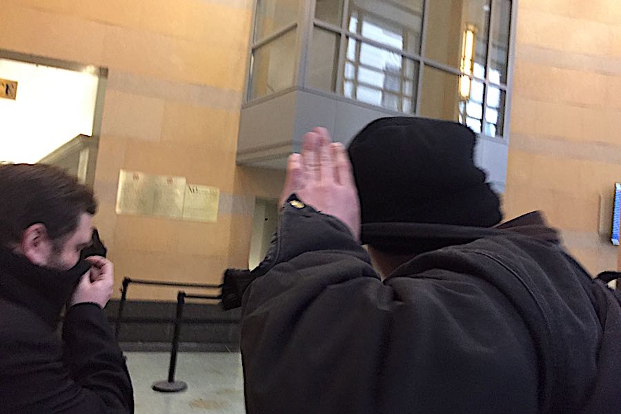 The suspects hide their faces from the cameras in the courthouse on Thursday.