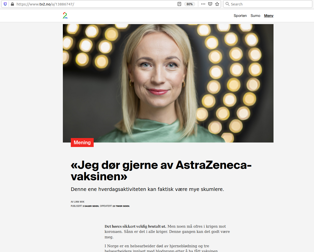 Jeg dør gjerne av AstraZeneca-vaksinen (English: I would love to die from the AstraZeneca vaccine)