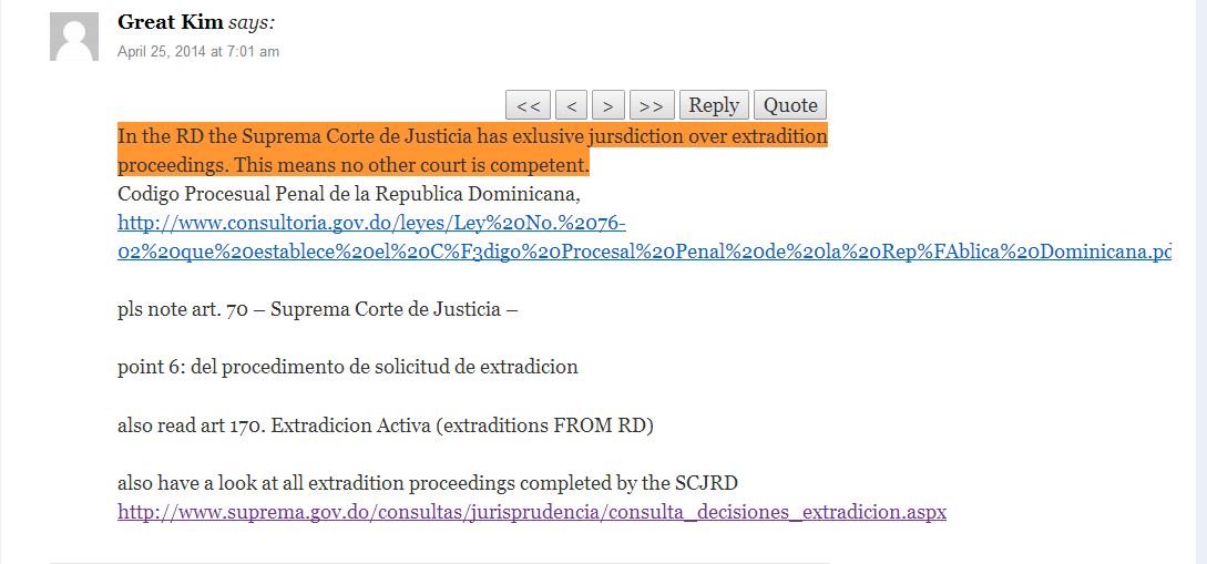 Great Kim aka Mik Taerg has indicated, several times and on at least three different websites, that: In the RD (i.e., the Dominican Republic) the Suprema Corte de Justicia has exlusive (sic) jursdiction (sic) over extradition proceedings. This means no other court is competent…also have a look at all extradition proceedings completed by the SCJRD