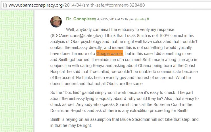 One problem with he, Lucas Smith’s argument. In the comment of Doc C’s, he highlights the Google Warrior without noting the rest of the comment which is that in this case, he decided NOT to use Google and go directly to the source which was the US Embassy in the Dominican Republic.