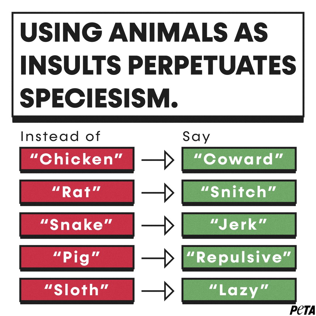 Quote from PETA’s twitter account (Jan. 26, 2021), “Words can create a more inclusive world, or perpetuate oppression. Calling someone an animal as an insult reinforces the myth that humans are superior to other animals & justified in violating them. Stand up for justice by rejecting supremacist language.”