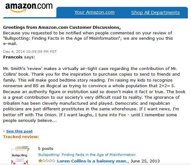 24. Why does Amazon sometimes remove review comments which appear to be legitimate (i.e., not spam, no advertising and no offensive/vulgar language)? The other week I received the following email notification from Amazon informing me that someone named “Francois” posted a new comment (Dec. 4th, 2014) regarding my review (June 25th, 2013) of Loren Collin’s book, Bullspotting: Finding Facts in the Age of Misinformation: