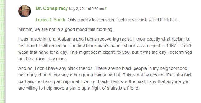 24 Responses to Fierce field research behind enemy lines. Dr. Conspiracy’s wife (Virginia Hutson Davidson) is a criminal and Loren Collins is a baloney man.