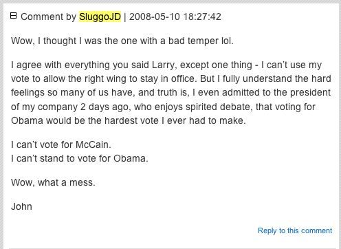 There are also a number of old, and strange, online posts in which SluggoJD aka John Dean aka whatever his real name is, wrote unfriendly remarks regarding Barack Obama.