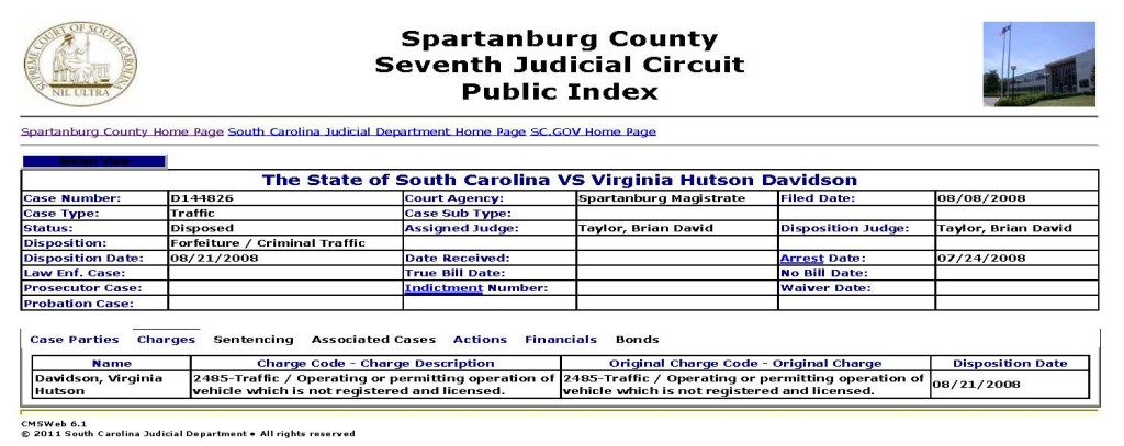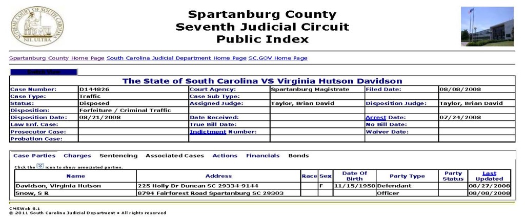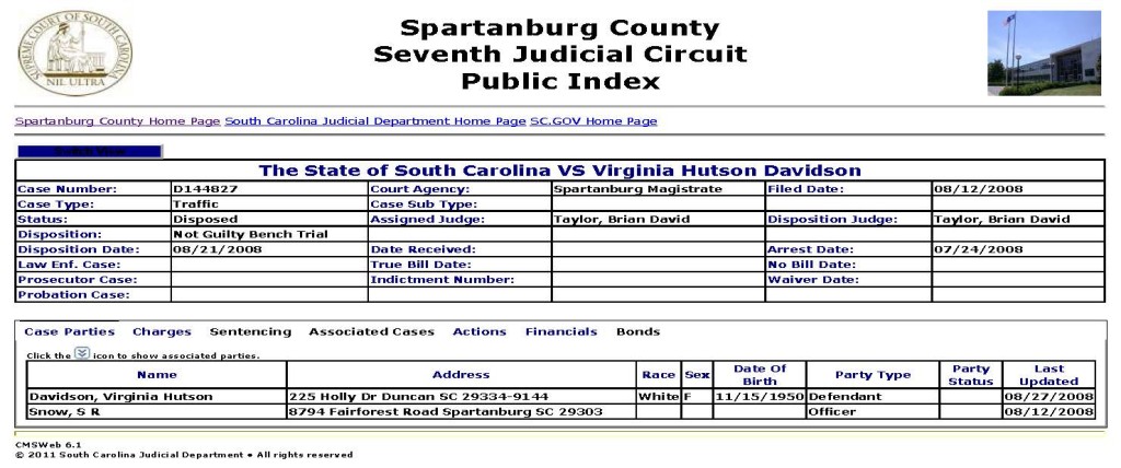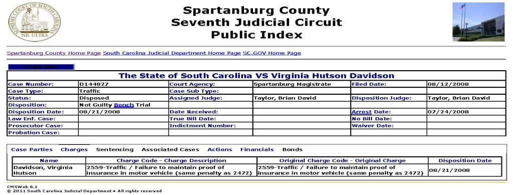 She was also charged in, yet not convicted, a separate traffic case, cause number D144827, filed 08.12.2008: 2559-Traffic / Failure to maintain proof of insurance in motor vehicle (same penalty as 2472).  Disposition: Not Guilty Bench Trial.  Note that in the two screenshots below this particular case is not a ‘Criminal Traffic’ case like the above cited criminal traffic case but is instead listed as ‘Traffic’ (non-criminal) and also note that her race, ‘White’, is listed (whereas it is not listed in the above cited criminal traffic case):