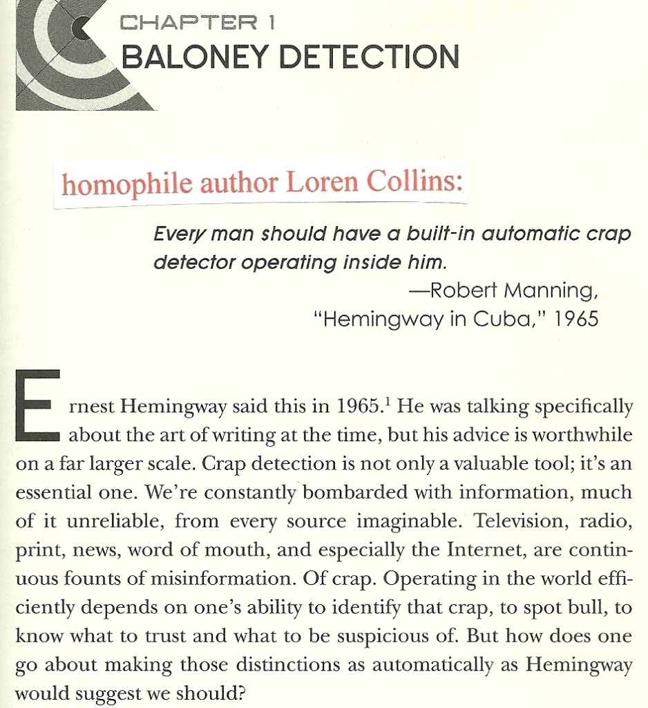 1.    Fact bungler and homophile author Loren Collins has published a book (pictured above in my photograph) titled, Bullspotting: Finding Facts in the Age of Misinformation.  The book is published by Prometheus Books.  In the first paragraph of Chapter 1, or ‘Baloney Detection’, we find that Collins confidently and forcefully asserts that Ernest Hemingway said, in 1965, “Every man should have a built-in automatic crap detector operating inside him.”