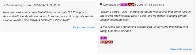 The foregoing comments (Susan and John Dean/SluggoJD) were once posted at an article, Obama Stands Accused of Conduct Unbecoming a Presidential Candidate [Updates: Chicago Tribune, more MSM], written by ‘SusanUnPC’. Susan, or Larry Johnson, at SluggoJD’s request, have now deleted the comments.
