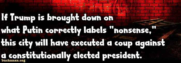 If Trump is brought down on the basis of what Putin correctly labels “nonsense,” this city will have executed a nonviolent coup against a constitutionally elected president. Such an act would drop us into the company of those Third World nations where such means are the customary ways that corrupt elites retain their hold on power.