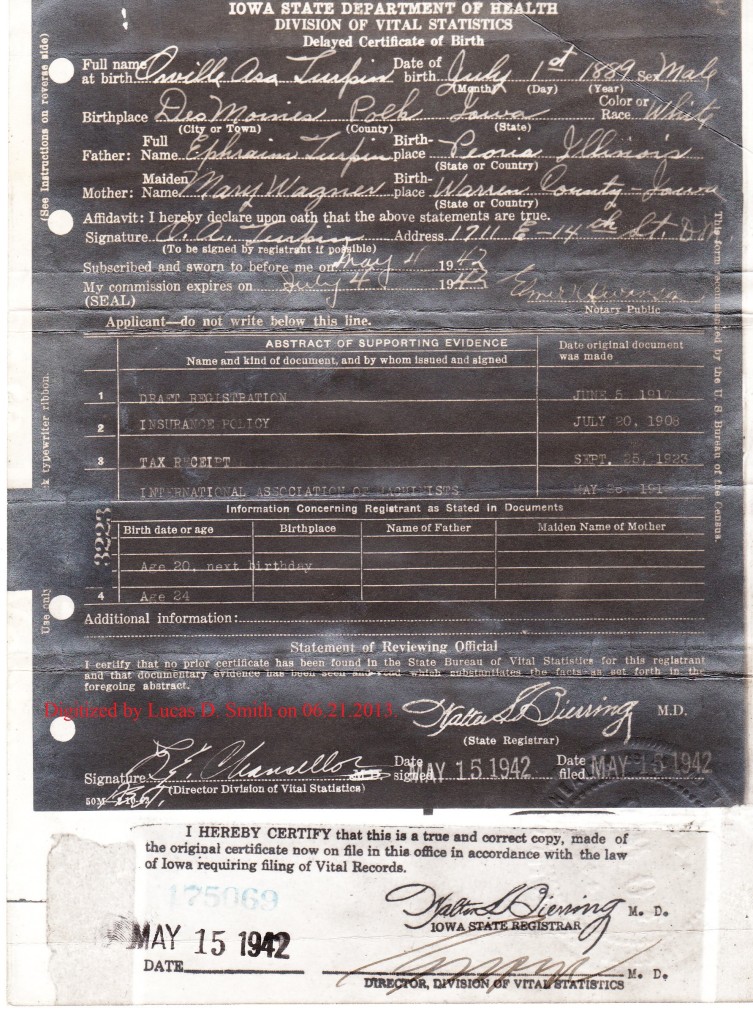 The birth certificate is a fake, there were no Turpins in Iowa in the year 1889.