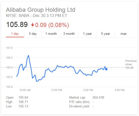 Alibaba was listed on the New York Stock Exchange. IPO (initial public offering) took place on Sept. 5th, 2014 with a per share price of $60 some dollars. As of today (Dec. 30th, 2014) the per share price is approximately $106 dollars: