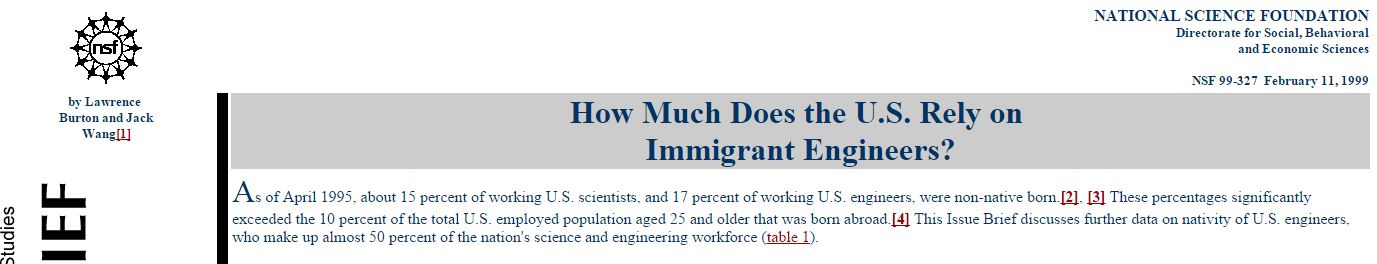 I don’t know what the percentages are at the moment (other than that they are substantially and extensively higher) but did you know that in 1995 about 15 percent of working US scientists, and 17 percent of working US engineers, were non-native born?