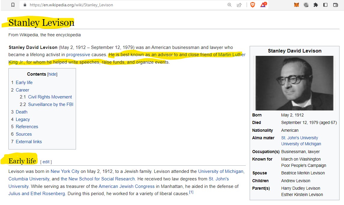 See Levison’s early life in the featured screenshot above and read more at wikipedia.org/wiki/Stanley_Levison (and here’s an archive from today (Jan. 16, 2023))