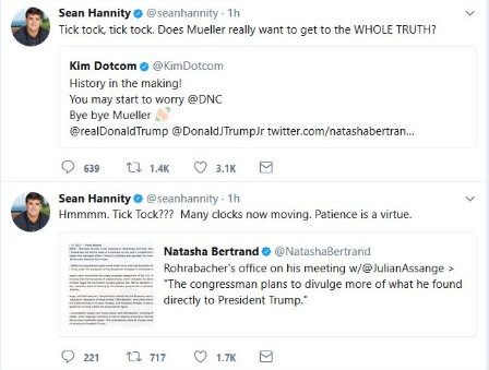 (Aug. 17, 2017) — At approximately 12:30 PM EDT, Fox News host Sean Hannity responded to a tweet from Internet entrepreneur Kim Dotcom by stating, “Tick tock, tick tock. Does Mueller really want to get to the WHOLE TRUTH?”