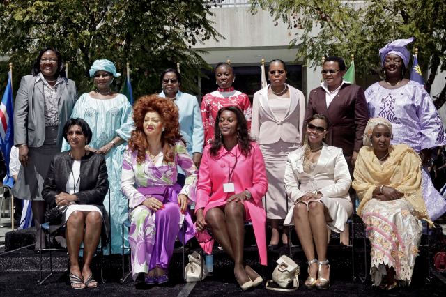 Standing back row from left: Ida Odinga wife of Kenyan prime minister; Hadjia Laraba Tandja of Niger; Penehupifo Pohamba of Namibia; Thandiwe Banda of Zambia; Maria da Luz Dai Guebuza of Mozambique; Mathato Sarah Mosisili of Lesotho and Sia Nyama Koroma of Sierra Leone. Seated front row from left: Adelcia Barreto Pires of Cape Verde; Chantal Biya of Cameroon; Ana Paula Dos Santos of Angola; Queen Inkhosikati LaMbikiza of Swaziland and Dr. Turai Umaru Yar’Adua of Nigeria. (AP Photo/Nick Ut)