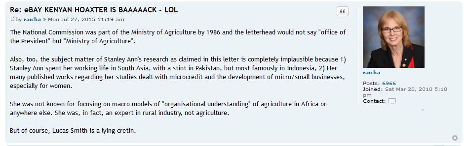 Also, too, the subject matter of Stanley Ann’s research as claimed in this letter is completely implausible because 1) Stanley Ann spent her working life in South Asia, with a stint in Pakistan, but most famously in Indonesia, 2) Her many published works regarding her studies dealt with microcredit and the development of micro/small businesses, especially for women.
