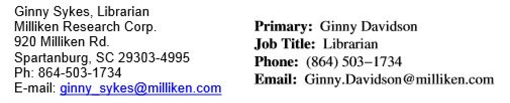 Ginny Davidson aka Ginny Sykes recently retired (or at least it appears that she retired) from Milliken & Company which is located in Spartanburg, South Carolina. Milliken is a fairly large outfit and claims to combine science with design and insights to create specialty chemicals, floor coverings and performance materials that do good for the world.