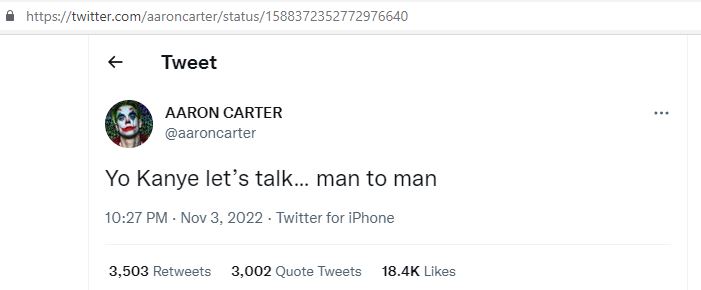 Aaron Carter (singer, Nickelodeon, Backstreet Boys, etc.) tweeted on November 3, 2022, “Yo Kanye let’s talk… man to man.” Carter was found dead in a bathtub two days later on November 5, 2022: