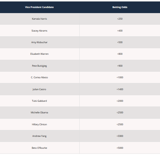 One very interesting candidate here is Michelle Obama at +2500. Former president Barack Obama has had his pulse on the election in recent days despite the fact that he has yet to officially endorse a candidate.