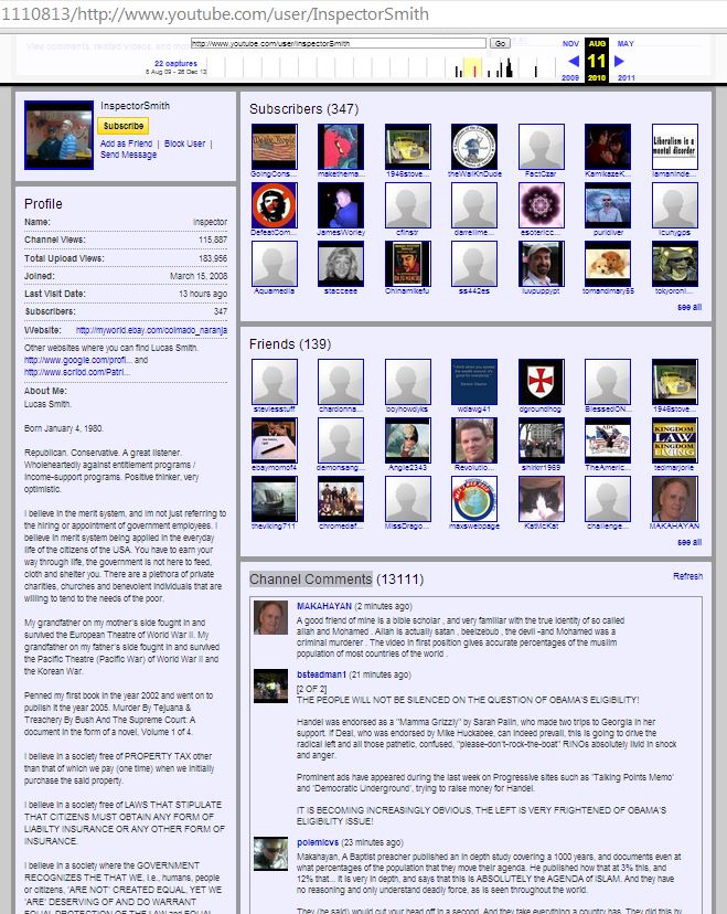 InspectorSmith Youtube “Channel Comments” as of August 11, 2010: