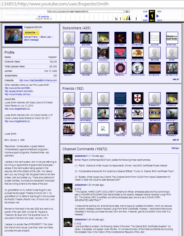 InspectorSmith Youtube “Channel Comments” as of May 1, 2011: