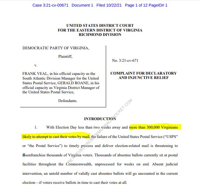 Here’s the complete Compliant filed by the Democratic Party of Virginia against the US Post Office: