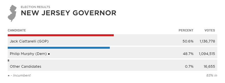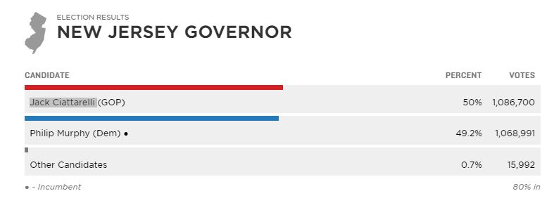 It appears also that Jack Ciattarelli (Republican) in the New Jersey Governor election has more votes so far (at 80% in according to the npr.org site relying on The Associated Press data) than his Democrat opponent:
