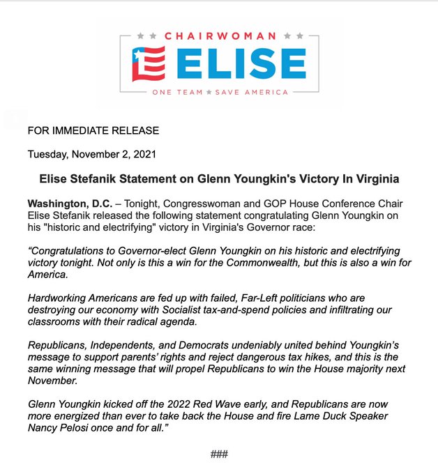 US Congresswoman Elise Stefanik congratulates Governor-elect Glenn Youngkin on his victory / win in Virginia. – November 2nd, 2021