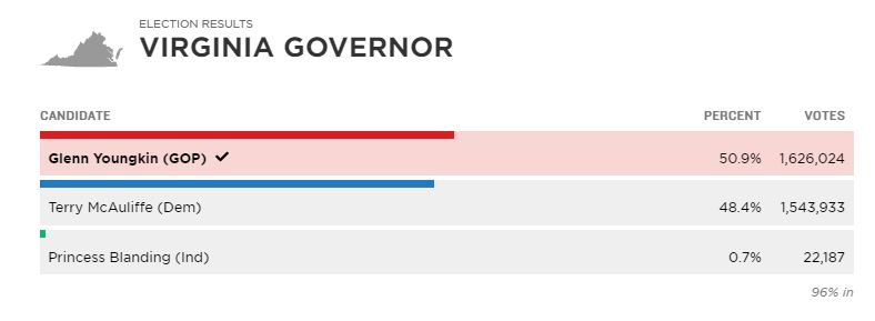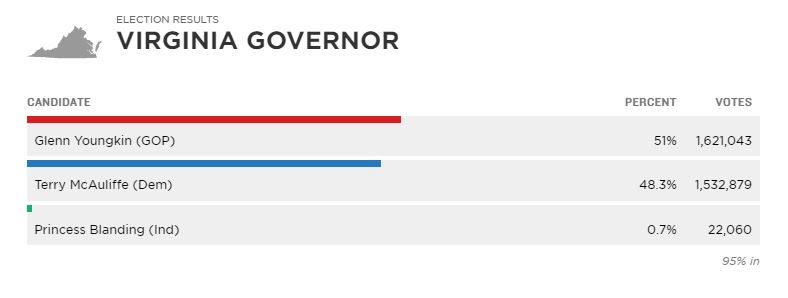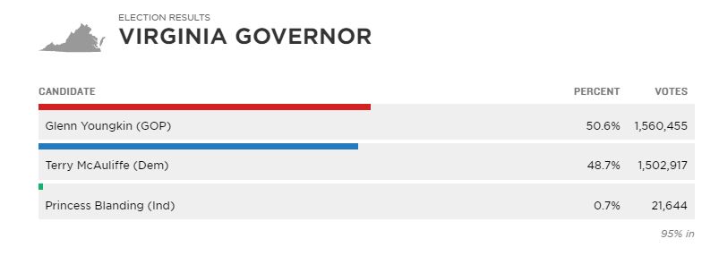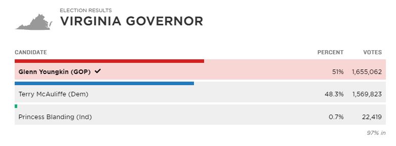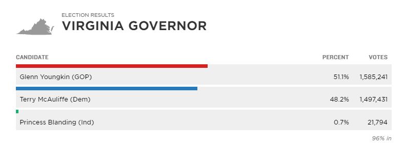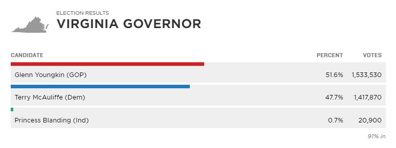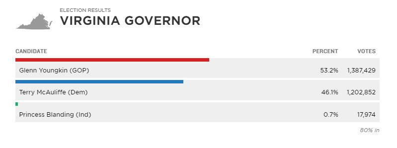 Here’s the most recent vote count (evening of Nov. 2nd, 2021) in Virginia: