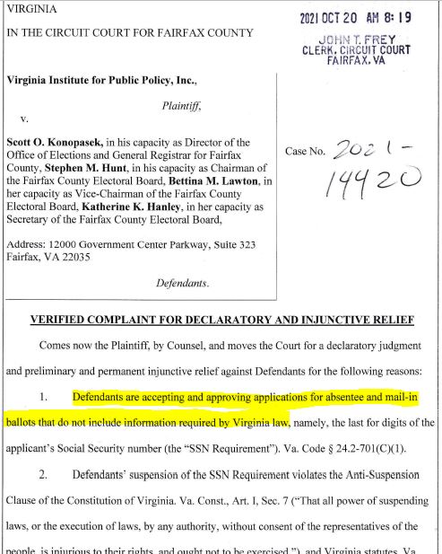 wasobamaborninkenya.com/blog/wp-content/uploads/2021/11/youngkin-virginia-mail-in-ballots-2021-complaint-fairfax-virginia-institute-for-public-policy-scott-konoopasek-elections-registrar-fairfax-county-viriginia-circuit-court.pdf
